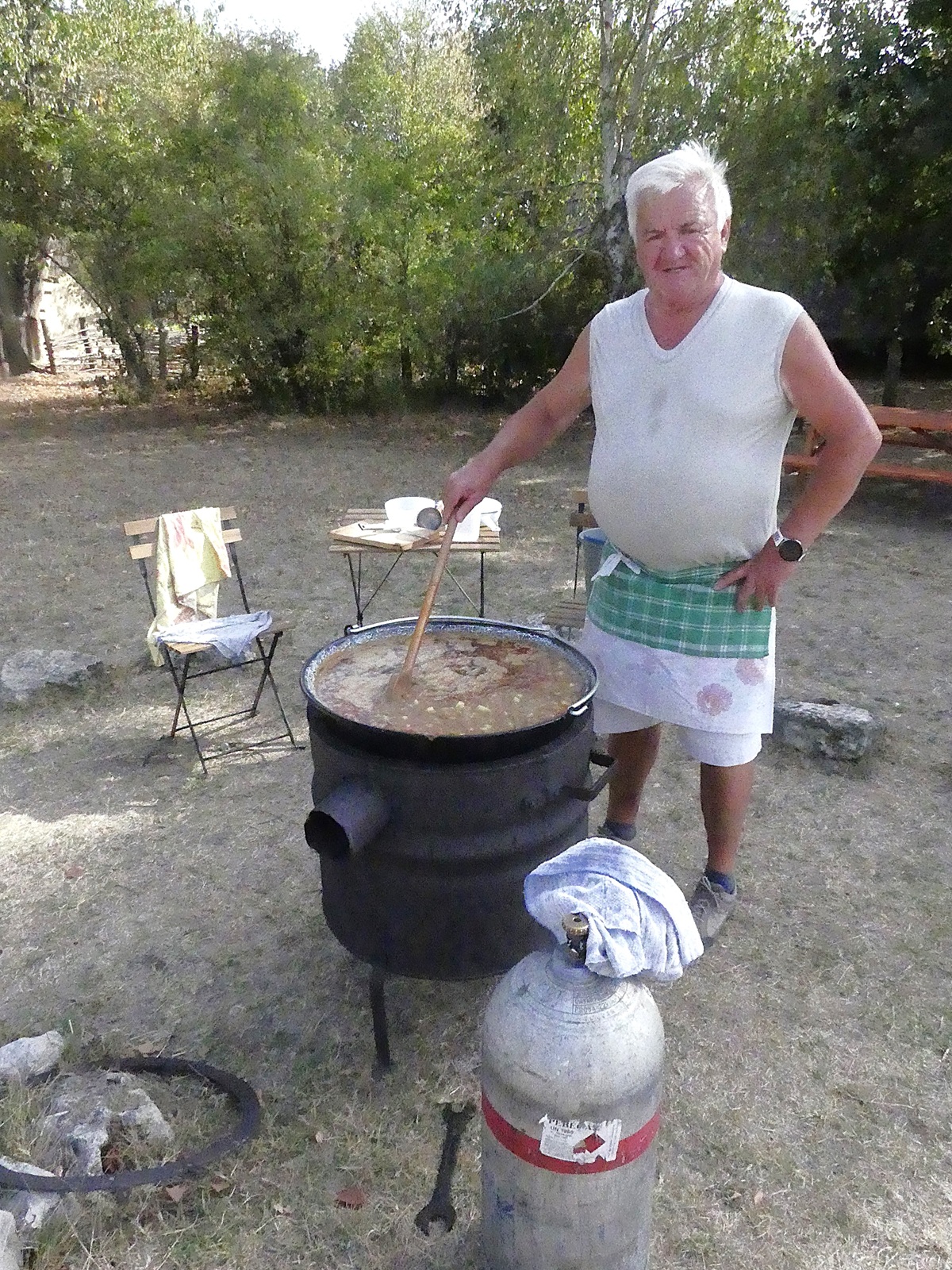 Az utóbbi években a Százhalombattai Régészeti Parkban rendeztük meg a nyárvégi szakosztályi találkozókat, most is ez volt a helyszín. Szépen összejött a csapat, hiszen 53 főt számoltunk össze. Továbbra is jó kapcsolatot ápolunk a múzeummal, emiatt nem kell bérleti díjat fizetnünk, az aktivistáink társadalmi munkájának ellenében. Mint már megszoktuk, a főszakács Kovi Pisti volt, a segédei is évek óta részt vesznek a főzésben. 13 órakor már a helyszínen voltak, az előkészületekkel foglalkoztak, hogy a marhalábszár gulyás időben elkészüljön. Négy órára hirdettük meg az összejövetelünket. A péntekre azért esett a választásunk, hogy minél többen részt vehessenek a találkozón. Négy órára a társaság nagyobbik része már a helyszínen volt, mire megérkeztek, az asztalokat megterítettük. A hozott italok és a sütemények az asztalra kerültek. A lipóti 3 kg-s kenyér felszeletelése is megtörtént. A terítés közben egymás finomságait is kóstolgattuk. Mindeközben persze jutott idő beszélgetésre.