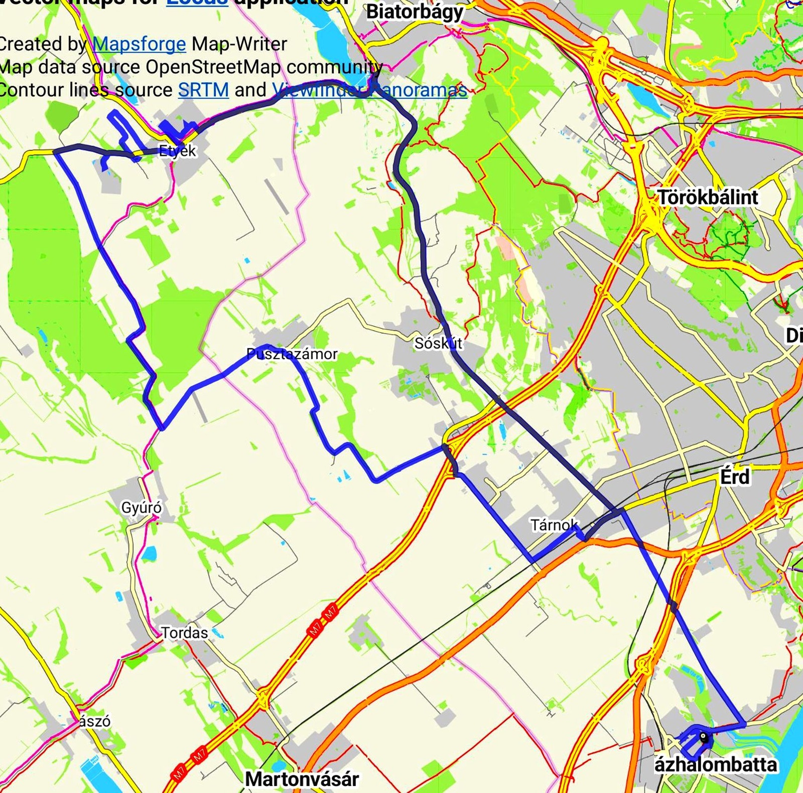 Útvonal: Százhalombatta – Érd – Tárnok – Pusztazámor – Etyek – Biatorbágy – Sóskút – Érd – SzázhalombattaA találkozópont Százhalombattán, az E-Batta kultúrkocsma előtt volt. Ketten innen kezdtük el a túrát. Elhaladtunk a Dunamenti Hőerőmű mellett, majd a körforgalomnál találkoztunk a csapat többi részével, akik az Óvárosból inkább ide jöttek. Most már hatan folytattuk az utunkat. Százhalombattát a Csenterics úton hagytuk el, majd kereszteztük a 6-os utat, majd az M6-os autópálya felüljáróján át értük el Érdet, ahol a Zámori útnál találkoztunk az Érdről és Budapestről érkezőkkel. Így lett teljes a mai 10 fős létszám. Innen Tárnok felé vettük az irányt, a vasútállomás aluljáróján kereszteztük a székesfehérvári vonalat. Majd a Géza utcai kerékpárúton folytattuk utunkat. A Benta-patakot kis gyalogos hídon kereszteztük, majd a Dózsa György úton jobbra kanyarodva nemsokára elértük az M7-es autópályát. A körforgalmon keresztül Pusztazámor felé vettük az irányt. Kis emelkedő árán a Regionális Hulladéklerakó mellett nemsokára Pusztazámorra értünk.
